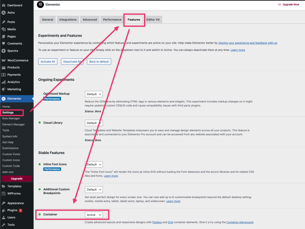Elementor Templates require the “Container” feature turned on before you can import them. This feature is currently disabled on your website, but don’t worry, it’s easy to turn on!